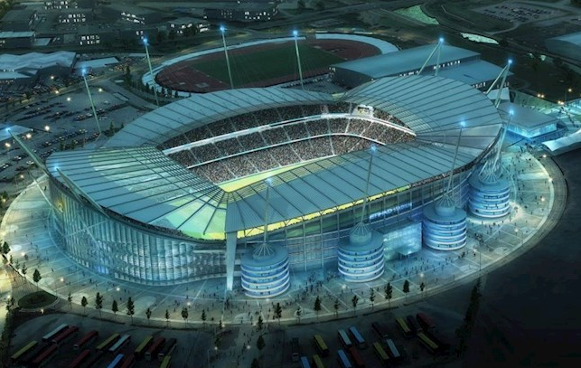 Sân vận động của Manchester City ban đầu được gọi là City of Manchester, và sau đó được gọi là Sân vận động Etihad vì lý do tài trợ sau khi ban lãnh đạo câu lạc bộ Anh đạt được thỏa thuận với Etihad Airways (hãng hàng không quốc gia của Các Tiểu vương quốc Ả Rập Thống nhất). Sân vận động có hình dạng cái bát, được bao quanh bởi hai tầng và có tầng thứ ba ở trên cùng. Tính đến ngày 1 tháng 7 năm 2009, sân vận động này được xếp hạng là sân vận động lớn thứ tư của Giải Ngoại hạng Anh và lớn thứ 20 ở Vương quốc Anh, với sức chứa 48.000 người. Năm 2008, sân vận động này đã tổ chức trận chung kết UEFA Cup 2008. Để đáp ứng nhu cầu của câu lạc bộ và người hâm mộ, Sân vận động Etihad đã được hiện đại hóa và mở rộng lên 60.000 chỗ ngồi trong mùa hè năm 2015 và 2016, đồng thời đáp ứng các tiêu chuẩn của UEFA. Sân vận động này ban đầu được xây dựng cho Thế vận hội Mùa hè năm 2000, nhưng Vương quốc Anh đã không giành được chức vô địch. Công trình này được xây dựng vào năm 2002 cho Đại hội thể thao Khối thịnh vượng chung với chi phí 110 triệu bảng Anh. Sau giải đấu, sân vận động này được sử dụng cho bóng đá và trở thành sân nhà của Manchester City, đội chuyển đến đây từ Maine Road vào năm 2003, ký hợp đồng thuê trong 250 năm.